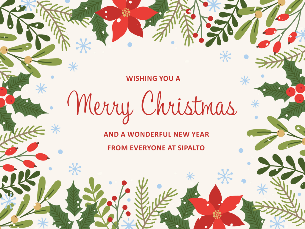 During the Christmas & New Year holiday season, the Sipalto office will be closed from 1pm on Wednesday 24th December and will be open for a limited period between Christmas and New Year as follows: